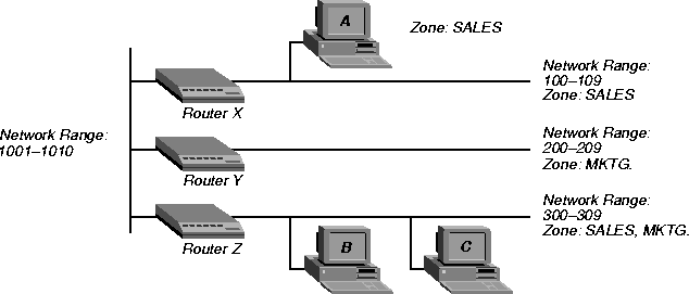 Figure 5-1 shows a network with three routers and three zones configured. Each zone has a range of network numbers.