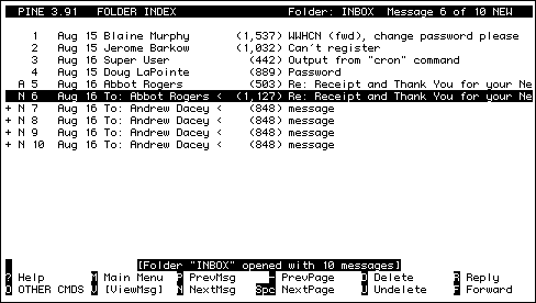 Pine also allows mail to be organized into folders to help organize your mail. By default Pine uses three folders; inbox, sent-mail, and saved-messages.