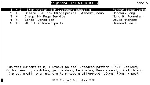 When users open tin they are taken to a list of news groups that are subscribed to. It is possible for the system admin to select groups that users are subscribed to by default.