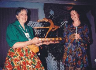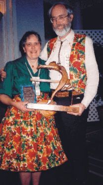 On Friday, November 2, 2001, at the opening ceremonies of the Maritime Square & Round Dance Convention, Dottie Welch washonoured with the "DANS AWARD", Dance Nova Scotia's highest honour, presented "as merited, not necessary annually, to an individualwho has given exceptional service to dance at the provincial, national and/or international level." The picture on the left shows Dottie holdingthe "DANS AWARD" as presented by Dianne Milligan, Executive Director of Dance Nova Scotia. The picture below shows Dottie with GaryWelch, her very supportive husband.