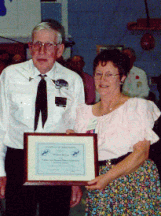 Special credit for the organization and chairing of the committees for this successful event goes to Wilfredand Goldie Burns, who due to their extreme modesty were not recognized for their twenty-two years ofdedication to the club, and their many years of teaching classes, as well as being Past Presidents.However, on the left is Inge Ruohoniemi, SRDFNS President, presenting Wilfred Burns with a retirementcertificate recognizing 32 years of calling.