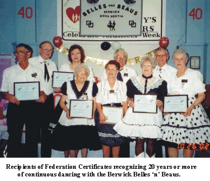 Several presentations were made through theevening. The SRDFNS presented the BerwickBelles 'n' Beaus with a certificate of appreciation for40 years of continuous dancing. SRDFNScertificates for over 20 years of continuous dancingwith the Belles 'n' Beaus were also presented to:Harris & Thelma Huntley (39yrs), Esther Chute(38yrs), Evelyn Shaw (31yrs), Ed & Betty Chiasson(29yrs), Lawrence Ernest (29yrs), Cordell & EdenaLevy (26yrs), George & Pearl Wotton (20yrs). Theabove dancers also received service bars from theclub for their appropriate years of continuousdancing as did the following: Stuart Wotton (20yrs),Dean & Barb Walker (17yrs), Barry Walker (16yrs),Pauline White, Bernie Jackson, Barb Ernest, TommyCollins & Marion Richards (15yrs), Jack & IreneBarlow (10yrs).
