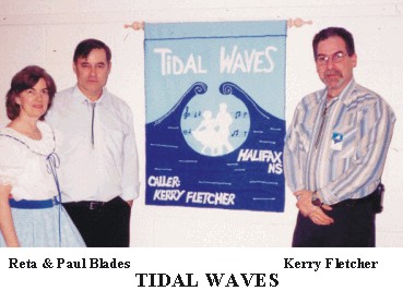 The banner depicts a square dance couple amidsttheir music surrounded by tidal waves. The banner wasdesigned and made by club members Reta and Paul Blades.