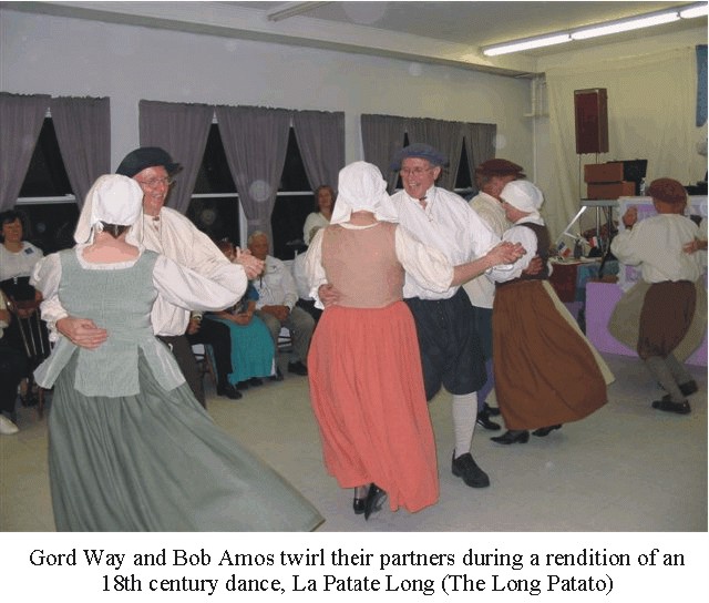 When the first French-speaking settlers arrived in North America they brought a variety of dances fromtheir homeland. Many of the early dances were performed in circle and chain formations, accompanied bysinging or simple instruments. The West King Twirlers demonstrated four of these dances that were sointegral to the way of life in the 17th and 18th centuries. They were: BRANLE DES SABOTS (CloggersBrawl), LA PATATE LONGUE (The Long Potato), LE REEL A QUATRE (The French Four) and theCajun 2 Step. These dances were the forerunners to modern Square & Round Dancing. [See pictures below]