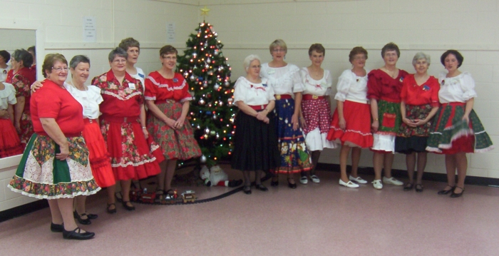 Three squares in full Christmas dress gathered at Bloomfield Centre on the morning of December 22 to dance in front of a CTV camera crew. Caller Dottie Welch put us through our paces, with a special teaching tip for good-natured host Cyril Lunney. Short introductory sessions were taped featuring four groups of six dancers. A "spokesperson" from each group was chosen to proclaim "Hi, I'm ----- and you're watching Morining Live on CTV!". The results were often hilarious, requiring one or more retakes. But all ended well, and the session aired the following morning to critical acclaim.