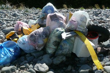 In total, volunteers collected 130 bags of garbage and recyclables from the shores of the 55 ha island. Among the unusual items found on the beaches today were: a Fischer X-country ski, a few miss-matched hiking boots, a box spring mattress, paint brushes and paint cans, and large fish bait boxes. There was also plenty of more commonly found items such as plastic bags, Styrofoam sheets, old tires, Tim Horton's coffee cups and plastic tampon applicators.