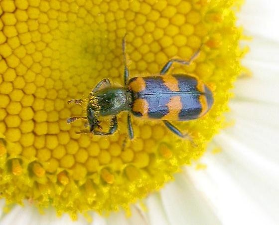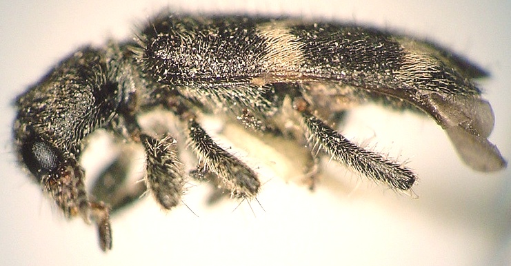 Trichodes nutalli (Kirby): 8.0-10.0 mm. This species has recently been discovered in New Brunswick by Sean Blaney. Not the densely hairy, narrow body and the blue-black elytra with variable orange patterning (usually with a transverse crossbar, and spots around the humeral umbone and sub-apical spots or bars) which distinguishes this species from any other clerid found in the region. The adults feed on pollen and are found on a variety of flowers including goldenrods (Solidago spp.). The larvae are predaceous on a variety of insect hosts including bees and grasshoppers (Opitz 2002).