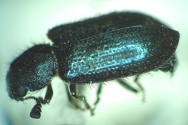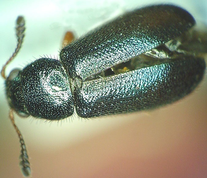 Necrobia rufipes (DeGeer): 3.5-6.0 mm. This species and the following are short rounded beetles with head, prontum and elytra a metallic greenish or bluish coloration. A distinctive feature of this genus is that the 9th and 10th antennomeres are narrowly transverse. N. rufipes has its legs and basal antennomere reddish brown. They are found on dried fish, skins and bones of dead animals, and other carrion where they are saprophagous and predaceous (Opitz 2002). This is a Cosmopolitan species probably originally from the Palearctic region and introduced here. To date they have only been recorded in Newfoundland and Nova Scotia in Atlantic Canada.
