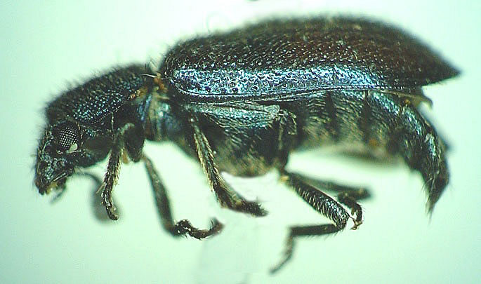 Necrobia violacea (Linnaeus): 3.2-4.5 mm. Similar in appearance to N. rufipes except that the legs and antennae are entirely dark. Also found on dried fish, skins and bones of dead animals, and other carrion where they are saprophagous and predaceous. This is also a Cosmopolitan species probably originally from the Palearctic region and introduced here. In this region they have been recorded in New Brunswick, Nova Scotia, Prince Edward Island, and Newfoundland.
