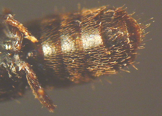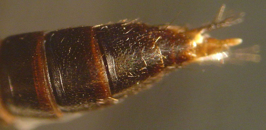 - Elytra and apical margins of abdominal tergites more or less paler, rather piceous brown. Length 4.0-4.9 mm. - Gabrius microphthalmus (Horn)