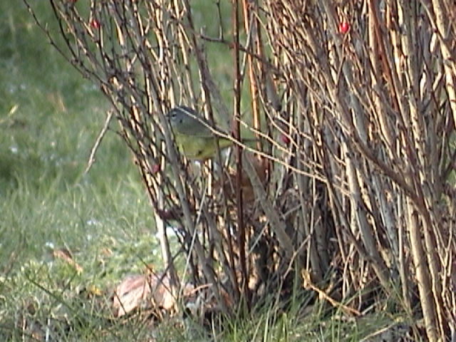 Illustrated here are four images of a MacGillivray's Warber (Oporornis tolmiei) photographed on December 4, 2000 in Halifax, Nova Scotia, Canada. The bird was first discovered in the area on November 20 and stayed in the vicinity until December 7 when cold weather caused it to disappear. This is the first record for this species in Nova Scotia and all of Atlantic Canada.