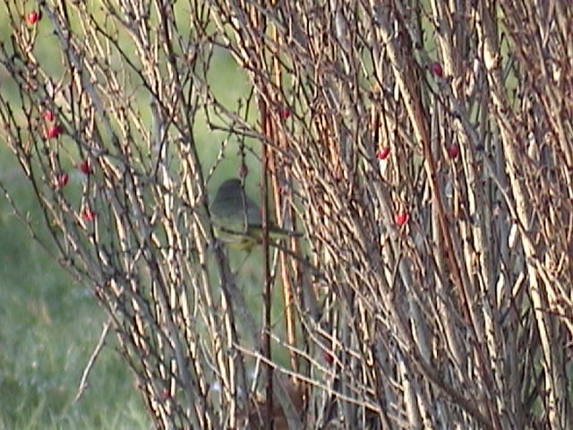The bird was often seen in the barberry hedge which runs along the front and west side of 6667 Jubilee Road. I observed it feeding by moving along the length of the hedge, also moving to the forsythia bush that is in the front yard. From there it several times moved to a large hedge that is in the back yard of 1720 Bloomingdale Terrace. The back yard of this house is separated from the previous by a large stone wall and it perches there, flying in an out of the hedge. It also forgaed low down amongst the lower limbs of the lilac bushes that separate the two yards.