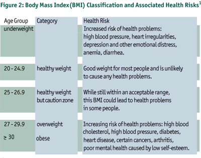 To assess the weight status of Nova Scotian adults, Body Mass Index (BMI) [9] was calculated from weights and heights measured during the clinic visit. Figure 2 presents standard BMI values associated with certain levels of health risk.