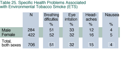 By far, breathing difficulties (51%) were the most commonly reported health problems from ETS, followed by eye irritation (32%), headaches (15%), and nausea (4%) (Table 25).