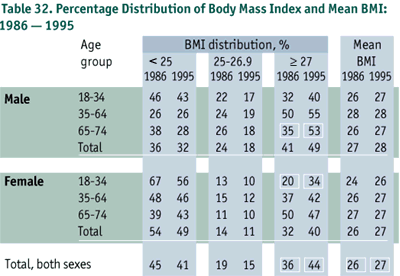 Over the past decade, the average BMI increased significantly from 26 to 27 (p < 0.05), while the percentage of people in the healthy-to-low weight range remained the same. The percentage of people who were overweight (BMI of 27-29.9) or obese (BMI > 30) increased from 36% to 44%, with young women (18-34 years) and men over age 65 showing the greatest increase (p < 0.05) (Table 32).