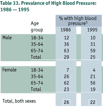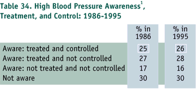 3. The prevalence of high blood pressure for the adult population decreased from 26% to 22%. However, the level of awareness and control of high blood pressure remained unchanged; and therefore a challenge exists to improve both awareness and control. A larger percentage of people (43% in 1995 vs 32% in 1986) were told their blood pressure in numbers following testing, which indicates an improvement in communicating blood pressure measurement to the public.