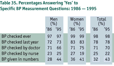 Questions about blood pressure measurement for 1986 and 1995 showed that there was an increase in the percentage of people who were told their blood pressure in numbers from 32% to 43% (p < 0.05) (Table 35).
