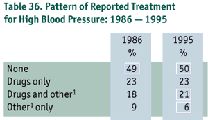 It is of concern that among those who had high blood pressure and were aware of their condition, only 50% were actively treating it with drugs, non- pharmacologic means (e.g. low sodium diet, weight control) or both (Table 36). There was virtually no change in the pattern of reported high blood pressure treatment between 1986 and 1995. The percentage of people reporting use of non- pharmacologic means was far from optimal, with 27% reporting it as a treatment used alone or in combination with drugs.