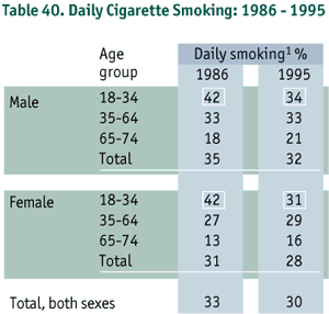4. Overall, smoking rates were the same when considering the total population. When examining separate age groups, however, there was a reduction in the proportion of 18-34 year-olds who currently smoke cigarettes daily. In 1986 the estimated prevalence for this age group was 42% for both men and women compared to the current 34% for men and 31% for women. Although this is a substantial drop, it is only to a level that is average for the total population. In the past several years smoking prevention and cessation programs have been aimed at younger populations, and the drop in rates for this group may partially be a result of those efforts.