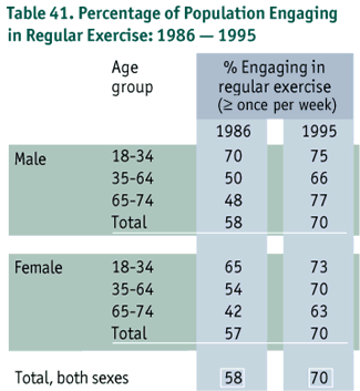 While 58% of the population reported exercising at least once per week in 1986, this number increased significantly to 70% in 1995 (p < 0.05). This finding reflects an increase in non-sedentary behaviour, one strategy advocated for improving health (Table 41).