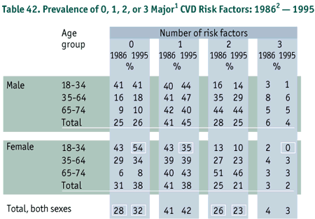 There was a statistically significant increase in the percentage of adults who had no major risk factors for CVD (high blood cholesterol, high blood pressure, or cigarette smoking) from 28% in 1986 to 32% in 1995, and it was females, particularly young females age 18-34, who contributed most to this change (p < 0.05). In fact, among young women (age 18-34) there were significant decreases in the percentage who had one and three major risk factors (p < 0.05). There was also a decrease in the percentage of adults who had two major risk factors (p < 0.05) (Table 42).