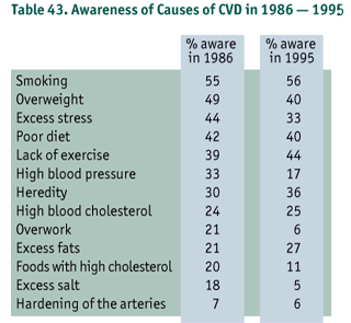 The percentage of the population reporting awareness of the various causes of heart disease changed over the decade, with statistically significant improvements for some factors and significant declines in others. Table 43 outlines these differences in awareness. Factors or behaviours where there was an increased level of awareness included lack of exercise, heredity, and excess fats (p < 0.05). Areas where level of awareness decreased included overweight, excess stress, high blood pressure, overwork, foods with high cholesterol, and excess salt (p < 0.05).