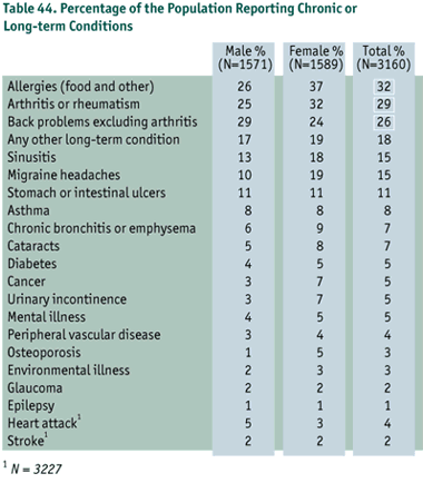 The most common chronic conditions were allergies, arthritis/rheumatism, and back problems, the latter two having an especially high cost in terms of personal suffering, lost productivity, and use of health resources (Badley, Rasooly,&Webster, 1994; Workers' Compensation Board of Nova Scotia, 1994 Annual Report).