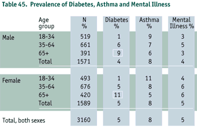 All conditions listed in Table 44 have personal and societal costs and require closer examination. However, due to limited space in this report, analysis has been limited to three conditions for which few provincial statistics exist. Table 45 presents additional information on diabetes, asthma, and mental illness. The prevalence of diabetes increased with age, while the prevalence of asthma and mental illness was relatively constant.