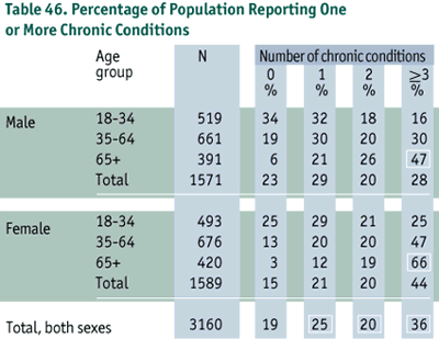 One-quarter of the population had at least one chronic condition, one-fifth had two conditions, and just over one-third had three or more. The percentage of people with three or more chronic conditions increased with age. In the oldest age group, significantly more women (66%) than men (47%) reported having three or more chronic conditions (p < 0.05) (Table 46).