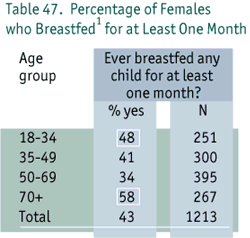 Breastfeeding benefits both infant and mother. Breast milk is easily digested, nutritionally sound as the sole source of nourishment for the first four to six months of an infant's life, and helps to reduce allergic tendencies in infants. Breastfeeding provides passive immunity to infants, controls milk intake optimally, helps develop oral musculature, and satisfies the infant's sucking reflex. For mothers, breastfeeding encourages mother/infant bonding, promotes weight loss following delivery, helps uterine tissue regain pre-pregnancy state, and provides a convenient, safe, environmentally sound, and inexpensive method of infant feeding (Nova Scotia Department of Health, 1995). Breastfeeding practices of Nova Scotian women have fluctuated over several generations. More women in the oldest age group (70 years of age and over) reported having breastfed their infants compared to women in the younger groups (p < 0.05). This rate declined for women aged 50-69 years and showed an increase for younger women, indicating a renewed interest in breast-feeding for mothers currently of child-bearing age (p < 0.05) (Table 47).