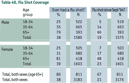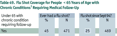 It is encouraging to note that approximately two-thirds of those aged 65 and over had a flu shot in the 1994-95 season (Table 48). However, only 25% of those in the younger "at risk" group (under age 65 with eligible chronic conditions) reported getting a flu shot in the 1994-95 flu season (Table 49).