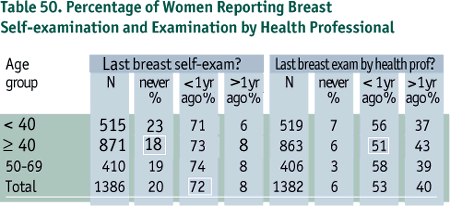 In Nova Scotia, breast cancer makes up 28% of all new cancers in women with 592 new cases diagnosed in 1994 (Nova Scotia Cancer Registry, 1993-1994). The chances of survival are much better when breast cancer is found and treated in its earliest stages. The Canadian Task Force on the Periodic Health Examination (1994) has recommended that women between the ages of 50 and 69 years have an annual breast examination done by a health professional. The Nova Scotia Breast Screening Program suggests that all women over 20 years of age perform a breast self- examination each month and that, in addition, all women over 40 have a manual breast examination done by a health professional at least once a year. It is encouraging that nearly three-quarters (72%) of adult women in Nova Scotia reported performing a breast self-examination in the past year and approximately one-half of the female population had received a breast examination by a health professional in the same time period. However, for those over 40, the fact that only 51% had a manual breast exam by a health professional in the past year and 18% had never performed a breast self-exam, is of concern (Table 50).