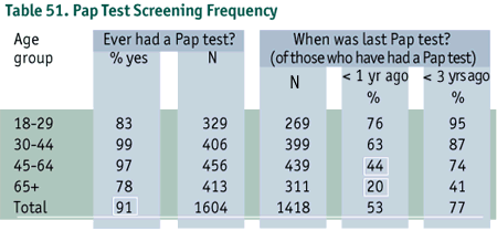 Although annual screening is recommended for all sexually active women over the age of 18 years, older women (those 45 and older) were less likely to have had a Pap test in the last year. Only 20% of women 65 and over, and 44% of those aged 45 to 64 reported having had a PAP test in the past year. The majority of women (91%) reported having had a PAP test at least once in their lifetime (Table 51).