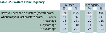 While 39% of all men reported having had a prostate examination, the figure rose to 68% in men aged 50 to 70 years. Among men aged 50-70 years, approximately one-third had never had an exam, 29% reported having had the examination less than one year ago, 13% said one to two years ago, and 26% said it was more than two years ago (Table 52).