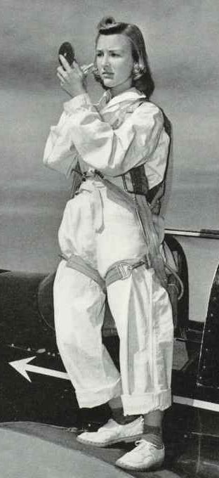 Flying Navy Nurse Kate freshens up before taking off for Berlin where she shares the podium with Gen. DeGaulle in the Grand Berlin Victory Salute March Past in 1945, the climactic scene in new movie , DUBYAS TWO.  Photo — Disney studios
