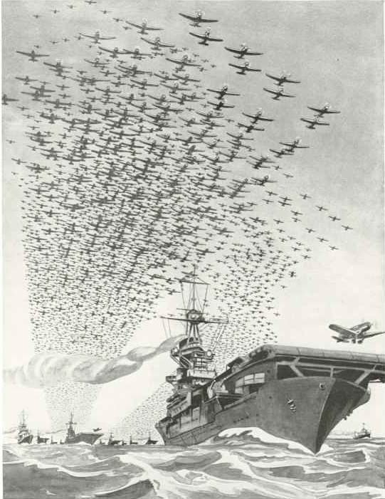 Anyway, Kate grinds the Lucky on the guard-rail and flicks the dying fag onto the flight deck. She is about to head below when she throws a quick parting glance at the sky. The camera focuses on her beautiful eyes that widen in alarm as she sees the sky filling up with thousands of evil looking Heinkle dive bombers obviously on their way to bomb London. Realizing there is not a second to lose, Kate pushes aside the officer of the deck (who has dozed off while reading a well thumbed copy of Stars and Stripes) and reaches for the PA mike. In a voice pregnant with authority and just a tinge of commanding hysteria, she yells: "All hands on deck! Pilots man your planes! Nazi bombers at eight o'clock!" Actually the bombers are all over the clock, but Kate has little time for accuracy. She must get those planes airborne.