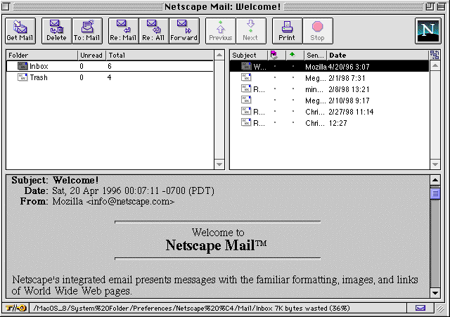 The right frame of the window shows the letters in the 'In Box' with indications as to their subject, who they are from, when they were received, if I have replied to them and so forth. Netscape allows you considerable control of what information is displayed and how.