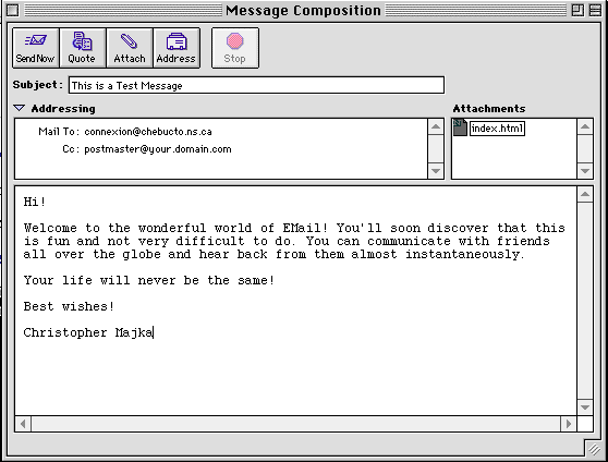 Below, is an identical example from Netscape Mail. You simply type, the subject, the Email address of the person you are sending the message to (and carbon copy) and the text of the message in the appropriate text boxes. By selecting the [Attach] button you can choose a file on your computer that you would like to attach to the message. Selecting [Addresses] takes you to your Address Box where you can simply select an Email address that you have previously recorded. After completing the message you press [Send Now] and off goes the message!