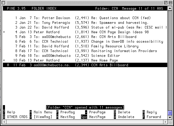 Below you see an example of a mailbox in PINE, a text-based Email program. You'll notice that there are a number of messages arranged in chronological sequence and numbered. For each one PINE tells me who it is from, the size (in kilobytes) of the message and its subject. Once I select any of the messages (the highlighted one in dark is the one which is currently selected) I can carry out any of the functions listed in the menu bar below. I can reply to it, delete it, forward it, move my selection point up or down in the menu, etc.