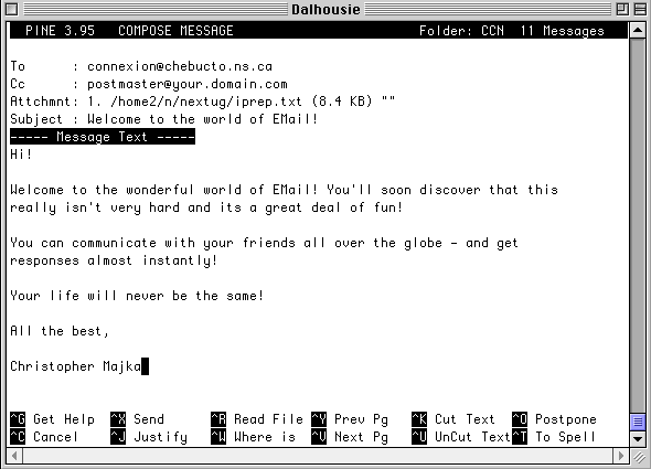 In the above example, from PINE, I am preparing to send a message to "connexion@chebucto.ns.ca" with a carbon copy to "postmaster@your.domain.com" with the file iprep.txt (which is 8.4 K in size) as an attachment. Again, the file menu at the bottom of the window displays some of the commands that I have available to assist me in composing messages and to manage my Email.